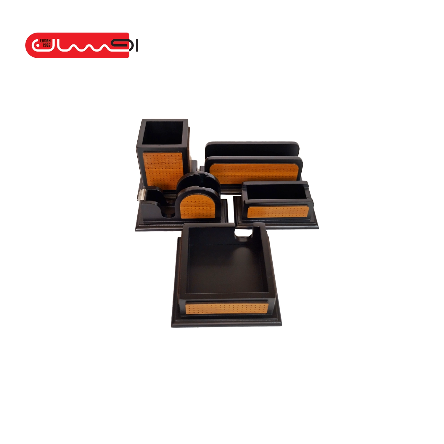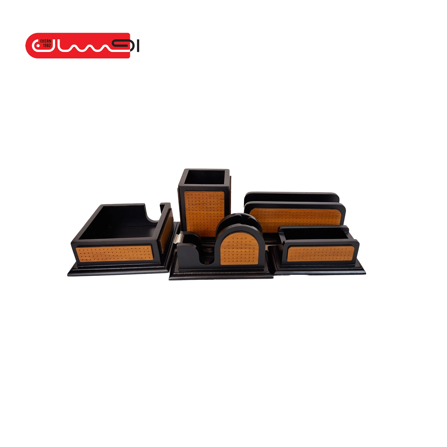 ست رومیزی 5 تکه ی مشبک چرم و چوب از MDF خالص تولید شده و محکم و بادوام است؛ این ست شامل یک عدد جا یادداشتی، پایه چسب، جاقلمی، جای پاکت نامه و جاکارتی است.