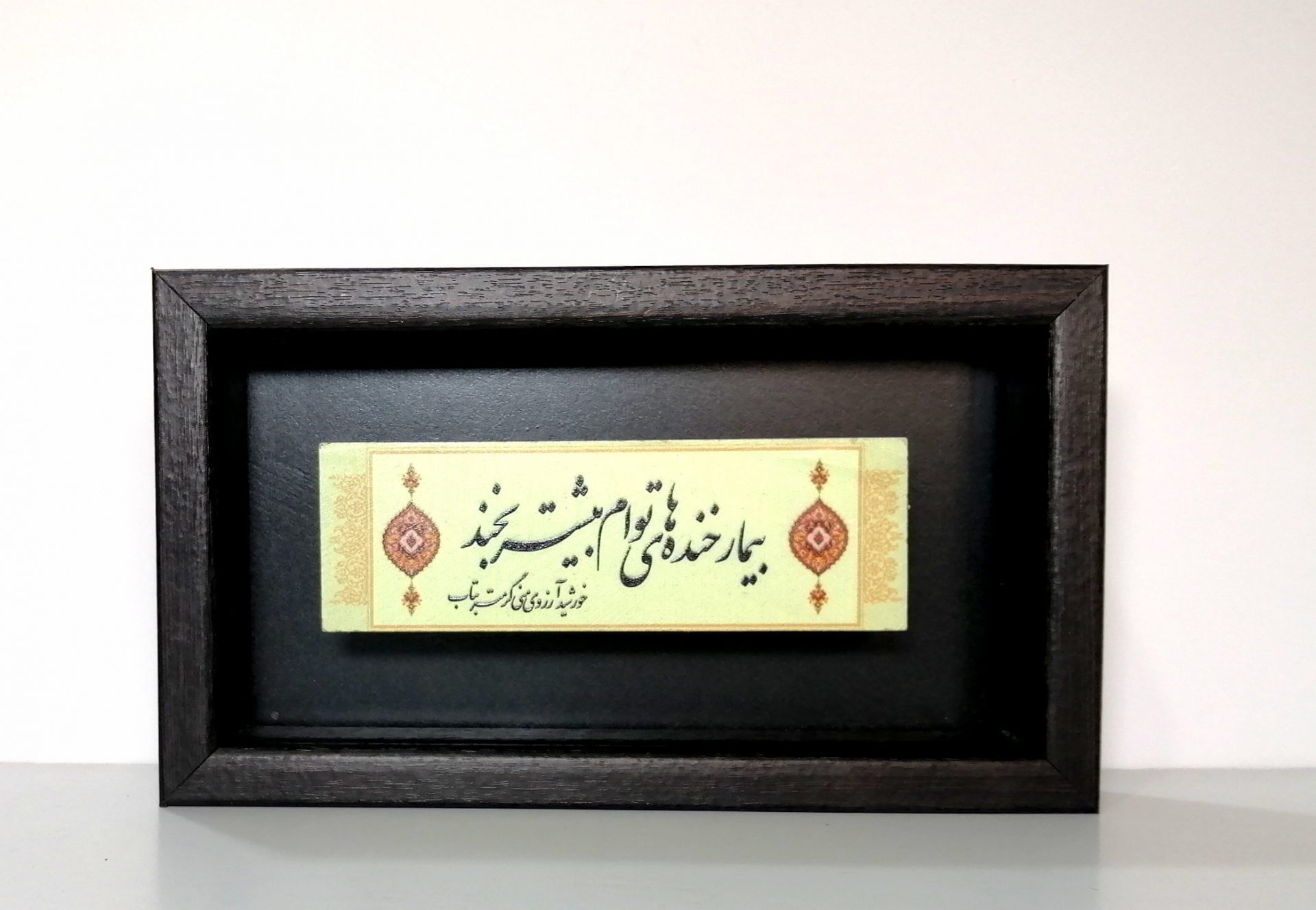 بدون شک یکی از زیباترین حروف الفبا در جهان، حروف الفبای فارسی و ایران یکی از معدود کشورهایی است که از خط خود به اشکال مختلف استفاده میکند.نستعلیق یکی از شیوههای نگارش خط در خوشنویسی فارسی است. این خط در ایران شکل گرفت و بیشتر هم در ایران رواج دارد و خوشنویسان ایرانی بیشتر با این خط به هنرنمایی میپردازند. خط نستعلیق معرف روح و فرهنگ ایرانی است و از آن در نوشتن متنهای ادبی و غیرمذهبی فارسی، اردو و به ندرت عربی استفاده میشود.«قاب خط نوشته روی سنگ طبیعی» یک محصول زیبای تزیینی است که نظر علاقهمندان به آثار منحصر به فرد و زیبا را به خود جلب خواهد کرد. تابلویی خوش نقش با قاب چوبی که می تواند حسابی در دکوراسیون داخلی خانه غوغا به پا کند. چوب ها که حتما نباید در ابعاد و مقیاس های بزرگ به کار گرفته شوند، گاهی هم می توانند به باریک ترین شکل ممکن در دکوراسیون داخلی خانه ظهور کنند. ترکیب چوب و سنگ را شاید بتوان اغوا کننده ترین مواد و مصالحی دانست که می توان از آن در طراحی دکوراسیون داخلی خانه استفاده کرد.این اثر با رنگ های بکار برده شده و عالی تهیه شده است روی سنگ که با اشعاری زیبا مزین شده میتواند یکی از انتخابهای شما برای تزیین خانه یا محل کار و حتی به عنوان هدیه باشد.این تابلو خطاطی شده، که با توجه به جنس مستحکم سنگ های مورد استفاده و کیفیت مواد رنگی به کار رفته، از جمله محصولات انتخابی مشتریان خوش سلیقه برای استفاده لوکس و دارای ماندگاری بالا در برابر نور خورشید و انواع نور مصنوعی، مواد شوینده و پاک کننده و آب می باشد. که میتواند به عنوان یک یادگار ماندگار نیز از طرف شما به دوستانتان هدیه داده شود .