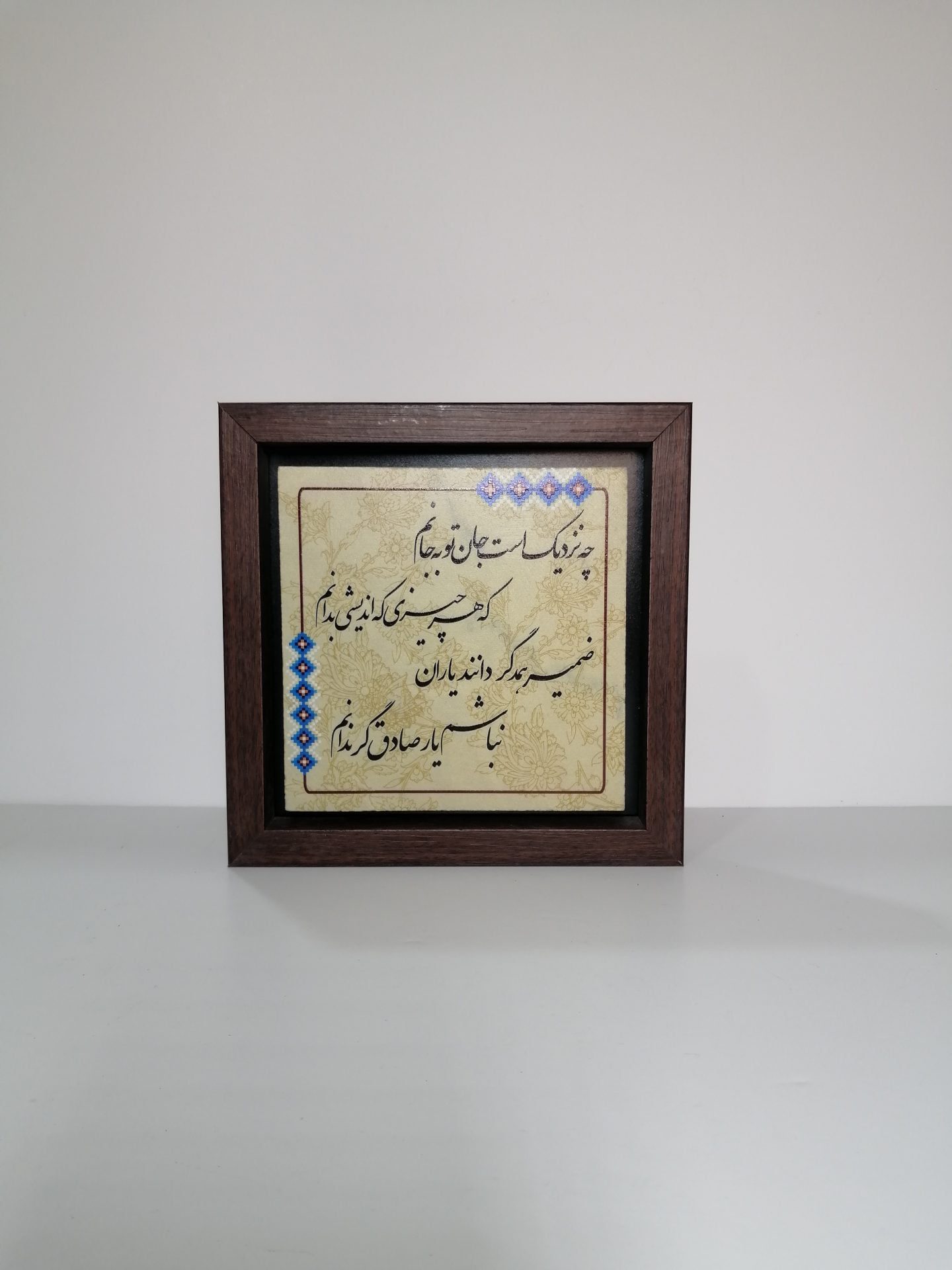 «قاب خط نوشته روی کاشی» یک محصول زیبای تزیینی است که نظر علاقه‌مندان به آثار منحصر به فرد و زیبا را به خود جلب خواهد کرد. تابلویی خوش نقش با قاب چوبی که می تواند حسابی در دکوراسیون داخلی خانه غوغا به پا کند لذا ترکیب چوب و کاشی را شاید بتوان از اغوا کننده ترین مواد و مصالحی دانست که می توان از آن در طراحی دکوراسیون داخلی خانه استفاده کرد. این اثر که از ترکیب رنگ ها و نقش و نگارهای سنتی ایرانی بر روی کاشی تهیه شده و به اشعار شعرای معروف یا سخنان بزرگان نیکو خصال مزین گشته می تواند هدیه ای ارزشمند برای دوستان و آشنایان باشد یا به عنوان انتخابی مناسب در دکوراسیون خانه شما جای گیرد. این تابلو خطاطی شده که معرف هنر ایرانی است، با توجه به کیفیت مواد بکار برده شده در طراحی و ساخت آن در برابر نور خورشید، انواع نور مصنوعی، مواد شوینده و پاک کننده و آب دارای دوام و ماندگاری بالا بوده و از زیبایی آن کاسته نمی شود.
